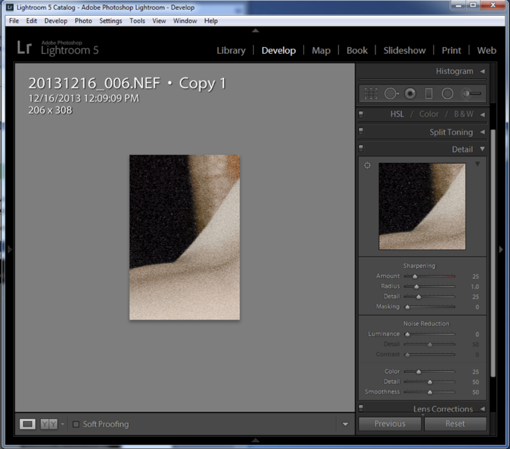 Note the mottled texture on the borders of the black area. Noise! In the black, there are barely visible light speckles. Noise again. All are very visible on your computer screen. At the right, note the noise reduction sliders. The simplest approach is to advance that slider until the noise disappears but not so much as to soften details or real textures.