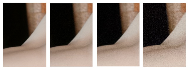 Let’s look at the image noise in a small portion of this scene as the ISO steps up in a Nikon D300S camera. From left to right they are ISO200, 800, 1600 and 6400. (206×308 pixel samples).